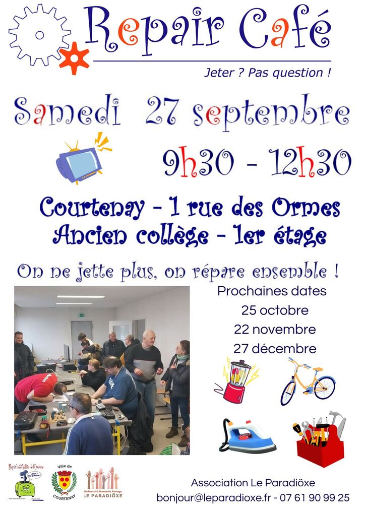 Consommez moins, consommez bien, jetez le moins possible et récupérez tout ce qui peut l’être et servir à d’autres. Le partage commence là, aux portes du Repair’café.
