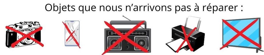 Nous faisons évidemment de notre mieux pour essayer de redonner vie au maximum d’objets sans considération de marque ou de valeur. Aucun chalenge ne nous fait peur ! Néanmoins, il faut admettre que certains objets nous résistent encore et toujours : les téléviseurs qui ne s’allument plus, les imprimantes encrassées ou qui n’avalent plus de papier, les minichaines-hifi défaillantes sont une véritable malédiction pour nous. Notre taux de réparation sur ces articles est proche de 0% depuis 9 ans. Par contre, si vous aviez un savoir-faire qui nous permettrait de changer la donne sur ce sujet, nous sommes preneurs !