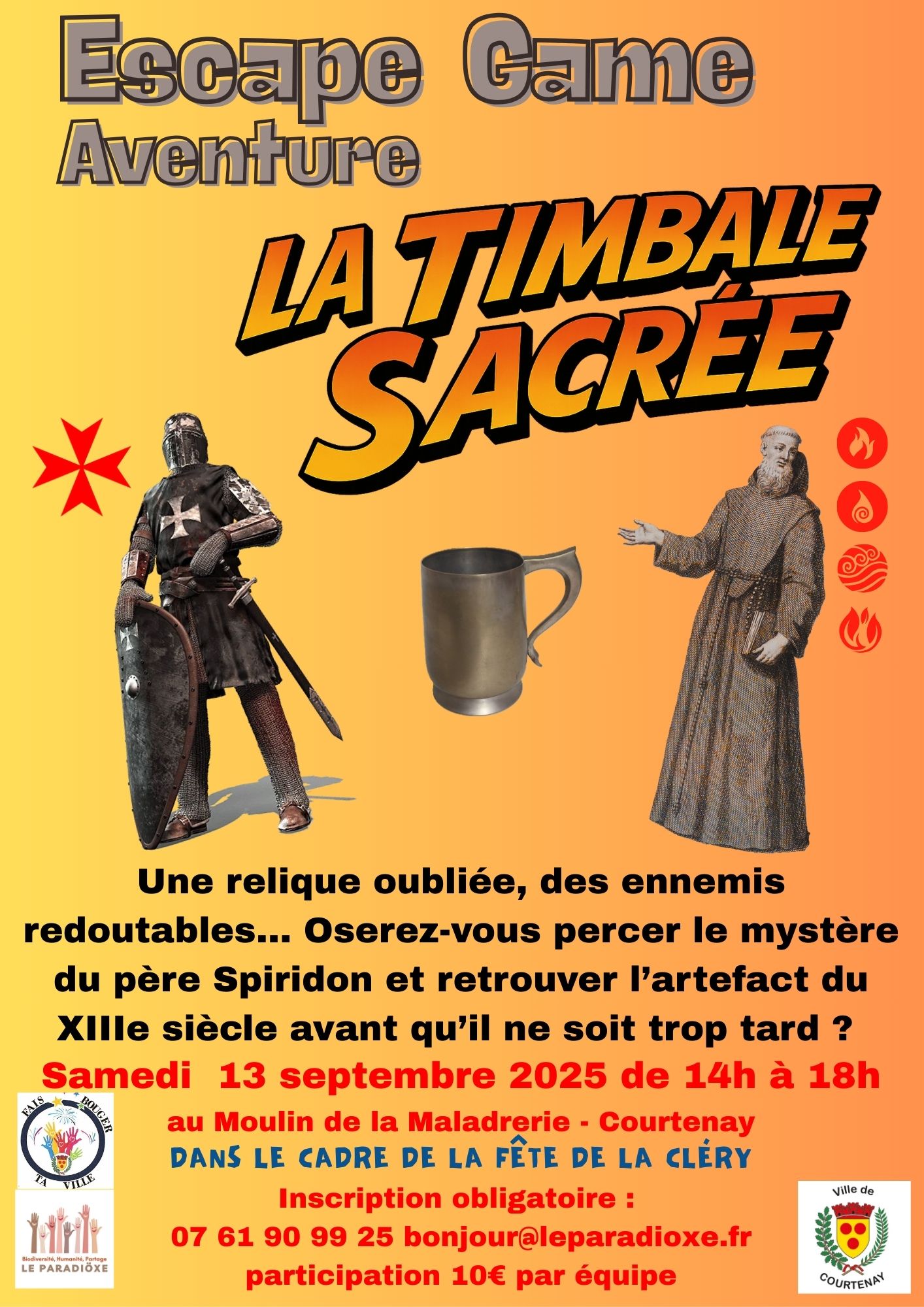 Courtenay - Le moulin de la Maladrerie 9 rue de la maladrerie, Courtenay, FranceÉvénement tiersUne relique oubliée, des ennemis redoutables... Oserez-vous percer le mystère du père Spiridon et retrouver l'artefact du XIIIe siècle avant qu'il ne soit trop tard ? Inscription obligatoire : 07 61 90 99 25 ou bonjour@paradioxe.fr