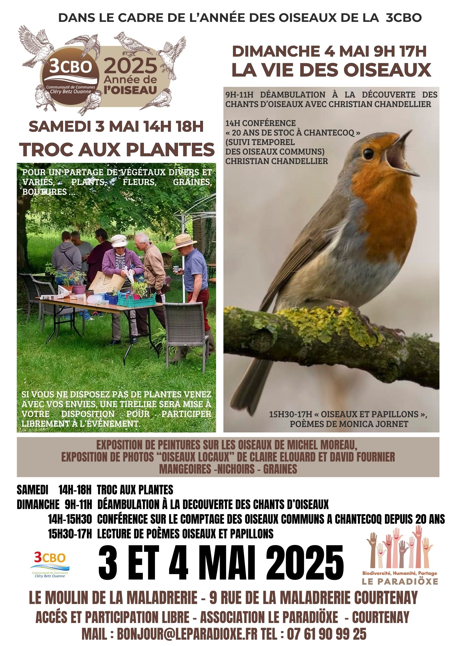 Courtenay - Le moulin de la Maladrerie 9 rue de la maladrerie, Courtenay, FranceÉvénement tiers9h-11h - déambulation à la découverte des chants d’oiseaux avec Christian CHANDELIER 14h - Conférence « 20 ans de STOC à Chantecoq » (Suivi Temporel des Oiseaux Communs) Christian CHANDELLIER 15h30-17h - « Oiseaux et papillons », poèmes de Monica JORNET Expositions temporaires : Exposition de peintures sur les oiseaux de Michel MOREAU, Exposition de …